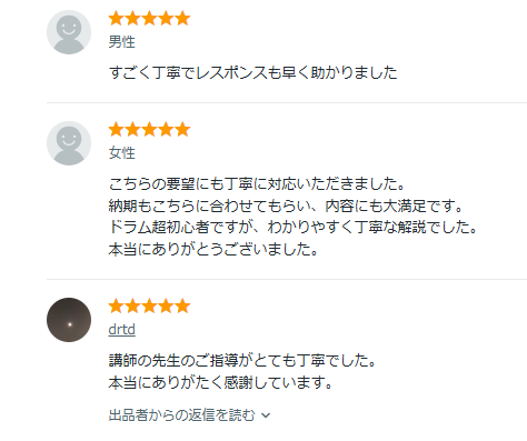 さきほど紹介したオンラインドラムレッスンの人気サービス上位出品の評判をまとめました。