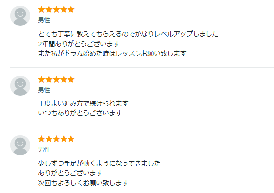 「とても丁寧」という声もあり、継続的にドラムを習いたい人はもちろん、丁寧な指導のもとで着実な成長を実感したい初心者の人におすすめのサービスです。