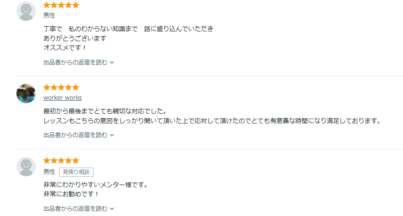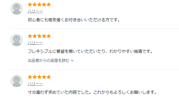 出品者によって価格帯もさまざまなので、比較しながら気になった出品者のレッスンを受けることができます。