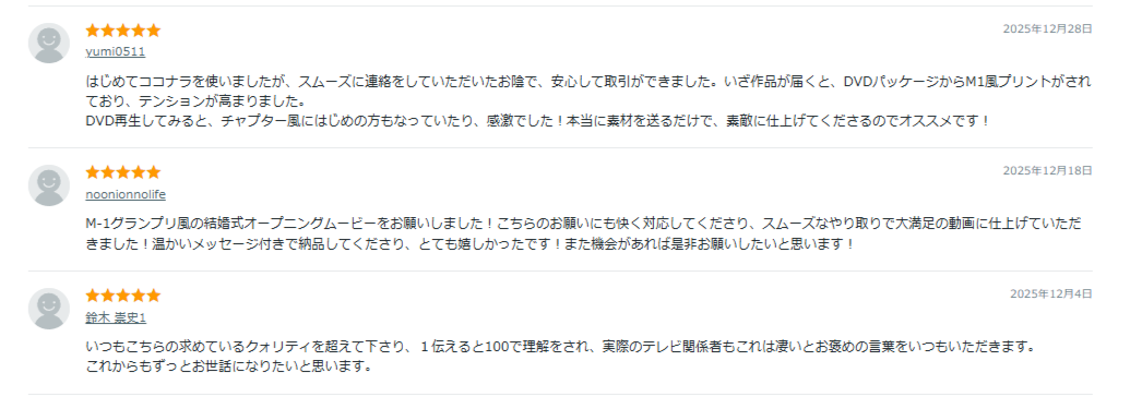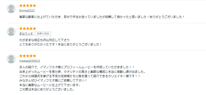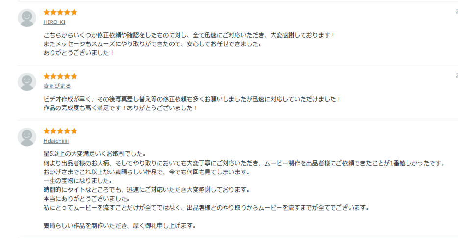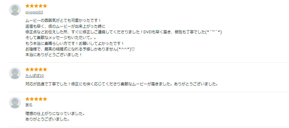 さきほど紹介した結婚式オープニングムービー制作の人気サービス上位出品の評判をまとめました。