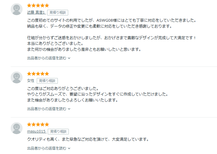 出品者はデザインの経験豊富なプロが多いので、クオリティも安心。他のクラウドソーシングサービスよりも低価格かつ高評価なサービスが多いので安心です。