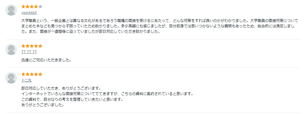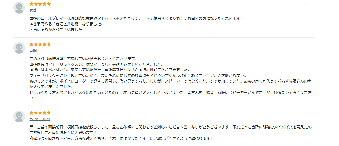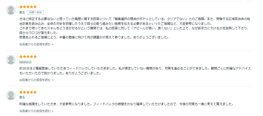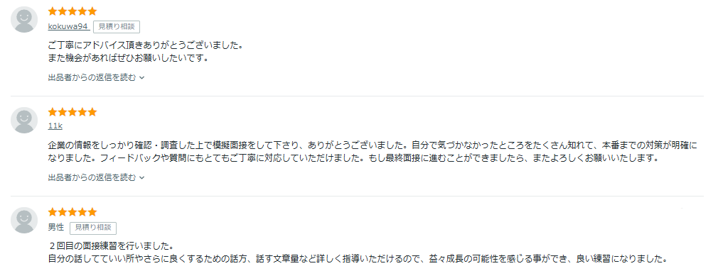 さきほど紹介した転職の面接対策の人気サービス上位出品の評判をまとめました。